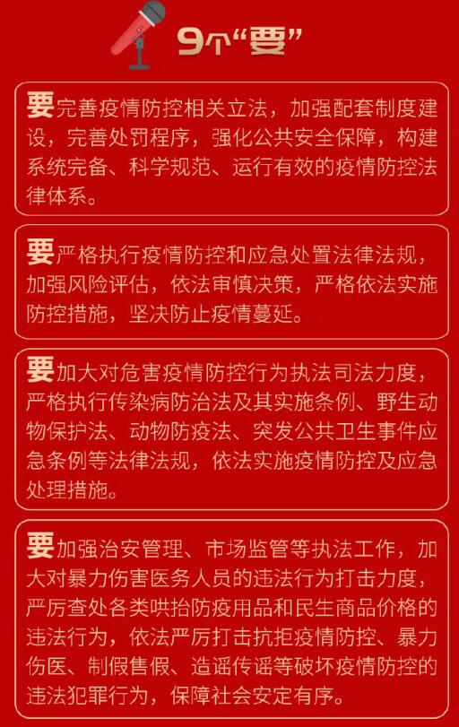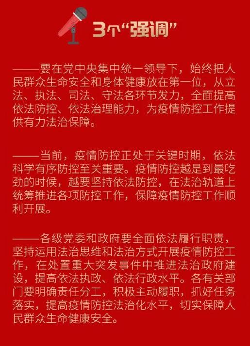 2月5日下午,中共中央總書記、國(guó)家主席、中央軍委主席、中央全面依法治國(guó)委員會(huì)主任習(xí)近平主持召開中央全面依法治國(guó)委員會(huì)第三次會(huì)議強(qiáng)調(diào),全面提高依法防控依法治理能力,為疫情防控提供有力法治保障。