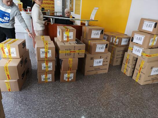 由于采購的防疫物資數(shù)量大,而又恰逢周末,貨運(yùn)公司人手不足。為爭分奪秒,縮短物資發(fā)運(yùn)時間,采購小組主動前往DHL航空貨運(yùn)公司,協(xié)助貨運(yùn)公司工作人員對防疫物資進(jìn)行分裝、打包、貼簽。然而難題又出現(xiàn)了,按照貨運(yùn)公司規(guī)定,大宗物資必須分批次進(jìn)行報關(guān)發(fā)貨,這樣好不容易采購到的防疫物資就不能全部在第一時間內(nèi)抵達(dá)國內(nèi)。經(jīng)過討論和咨詢,并與貨運(yùn)公司反復(fù)協(xié)商,駐阿經(jīng)理部決定以公司名義辦理報關(guān),并迅速整理遞交了報關(guān)資料,全力協(xié)助DHL貨運(yùn)公司發(fā)運(yùn)防疫物資,最大限度確保防疫物資盡快運(yùn)抵國內(nèi)。