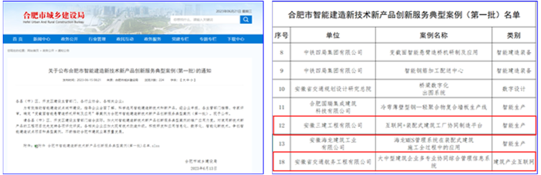 近日,合肥市城鄉(xiāng)建設(shè)局發(fā)布《關(guān)于公布合肥市智能建造新技術(shù)新產(chǎn)品創(chuàng)新服務(wù)典型案例(第一批)的通知》,經(jīng)企業(yè)申報(bào)、各主管部門(mén)推薦、專(zhuān)家評(píng)審,確定18個(gè)案例為合肥市智能建造新技術(shù)新產(chǎn)品創(chuàng)新服務(wù)典型案例(第一批)。其中,由集團(tuán)推薦的建工三建“互聯(lián)網(wǎng)+裝配式建筑工廠協(xié)同制造平臺(tái)”和建工交航“大中型建筑企業(yè)多專(zhuān)業(yè)協(xié)同綜合管理信息系統(tǒng)”兩案例成功入選。