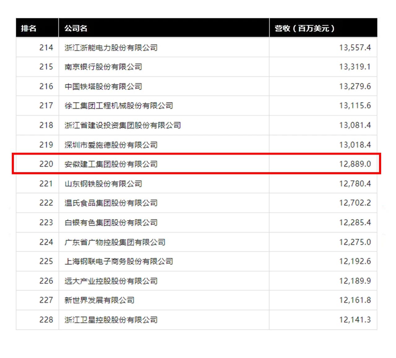 財(cái)富Plus APP于北京時(shí)間7月25日發(fā)布了2024年《財(cái)富》中國(guó)500強(qiáng)排行榜。安徽建工集團(tuán)股份有限公司以12,889.0百萬(wàn)美元的營(yíng)收名列第220位。