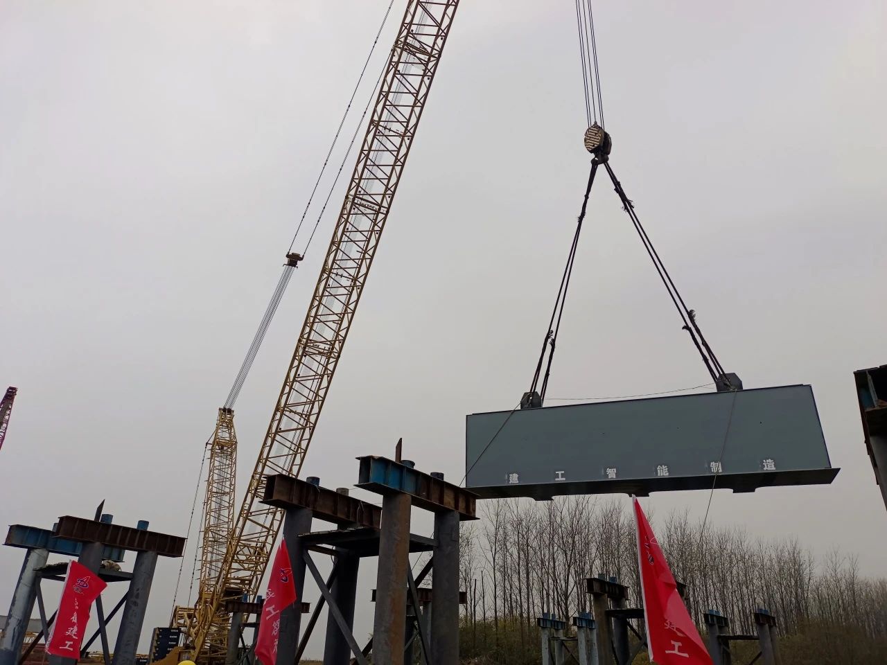 近日,建工智能制造蕪湖公司淮南至桐城高速公路合肥段路基路面施工—2標(biāo)淠河總干渠大橋首片鋼箱梁順利架設(shè)。