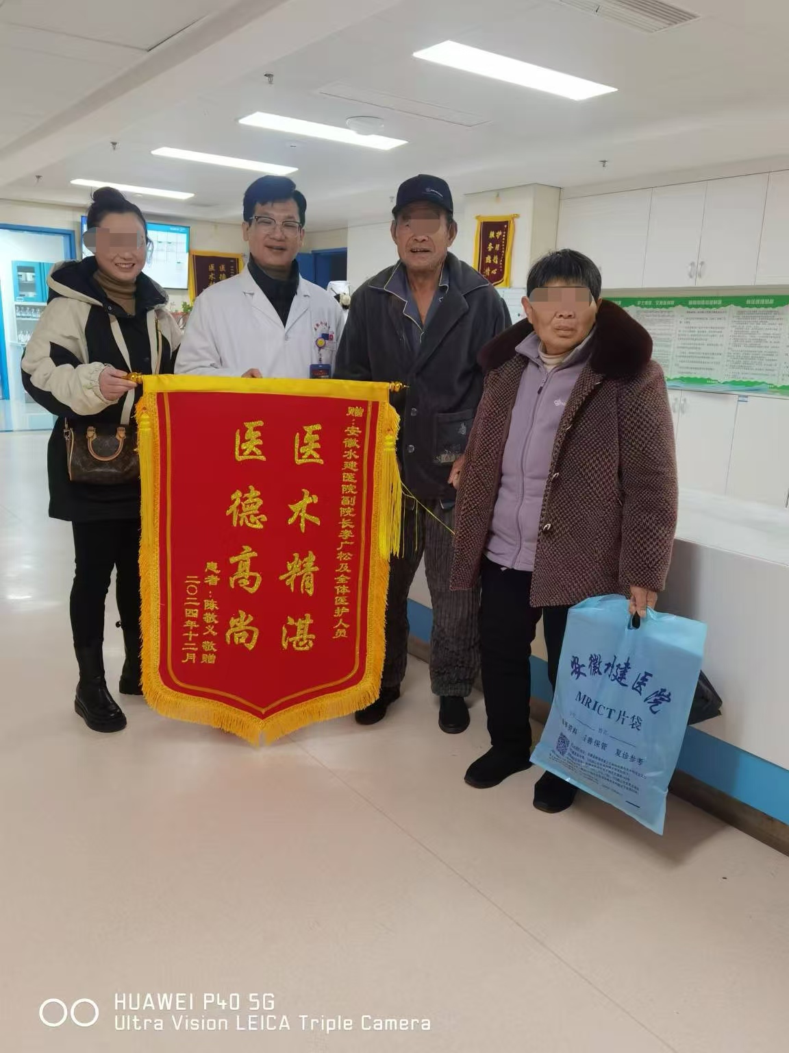手術(shù)后,李先生恢復(fù)良好,他滿懷感激,特意攜家人一同送來錦旗,感謝穆主任和葉龍安醫(yī)生以及全體醫(yī)護人員。