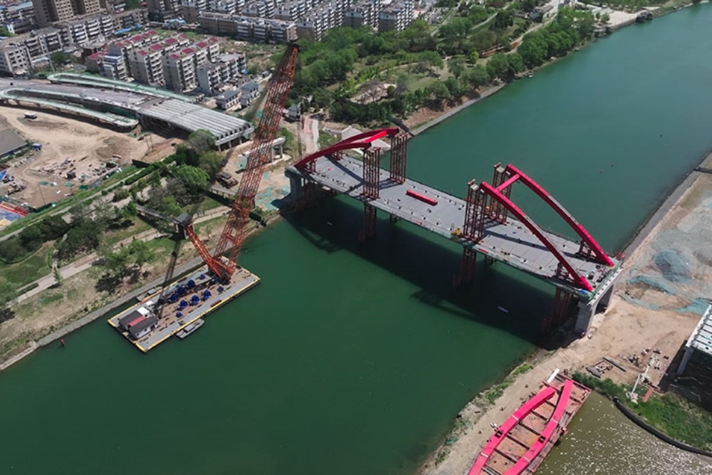 目前,該項(xiàng)目已完成鋼箱梁主體、橋面板、拱肋合龍等主體工作?!拔逡弧奔倨诶铮?xiàng)目啟動(dòng)吊桿張拉作業(yè),同步推進(jìn)水平系桿張拉與涂裝收尾,實(shí)現(xiàn)多專業(yè)立體施工,向著完成全橋主體施工節(jié)點(diǎn)發(fā)起最后沖刺。