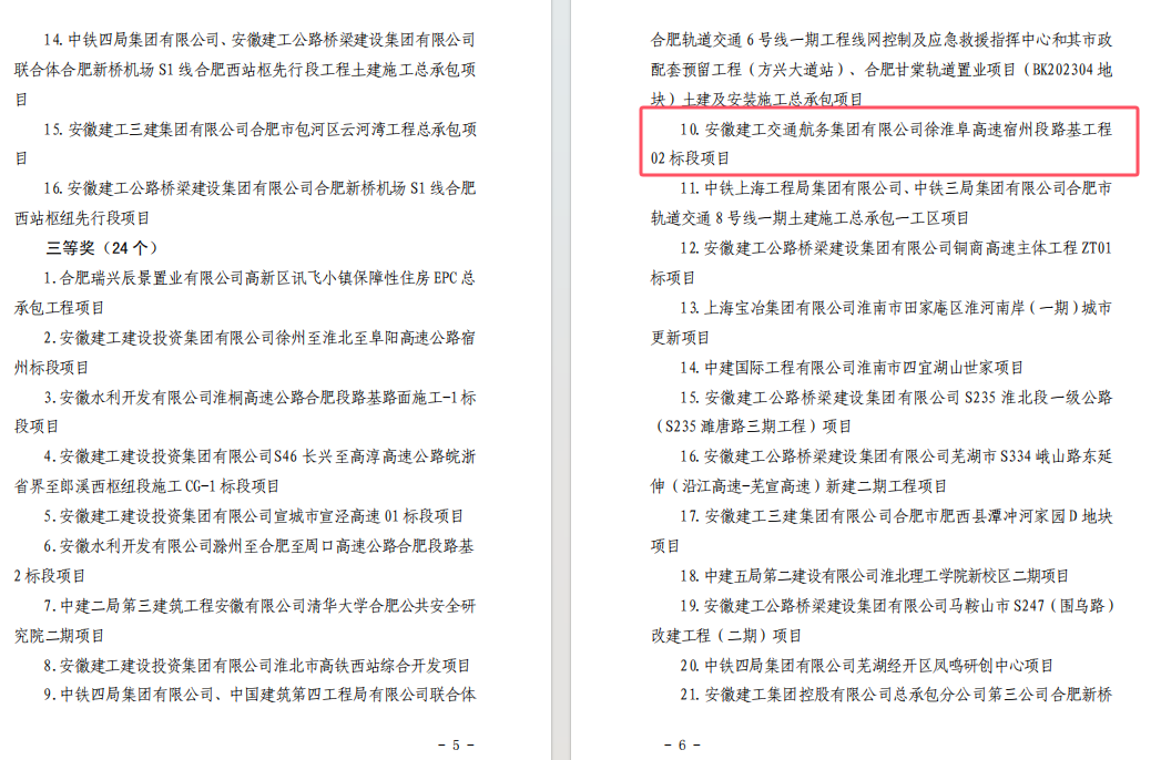 近日,安徽省住房和城鄉(xiāng)建設廳、安徽省總工會聯合發(fā)布《關于表揚 2024 年度安徽省重大項目建設勞動競賽優(yōu)秀項目的通報》,公司潭沖河家園 D、E 地塊 EPC 總承包項目和徐淮阜高速宿州段路基工程 02 標項目表現突出,成功入選優(yōu)秀項目名單。